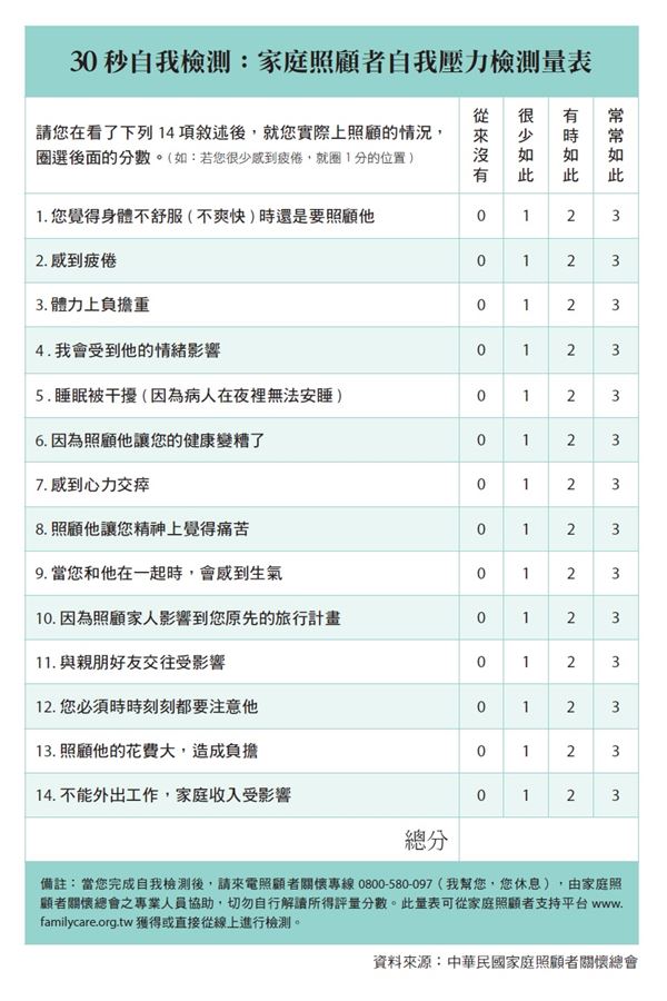 「中華民國家庭照顧者關懷總會」製作了一份「家庭照顧者自我壓力檢測量表」, 建議照顧者可以隨時自我檢測, 了解自己身心狀態並做調整。