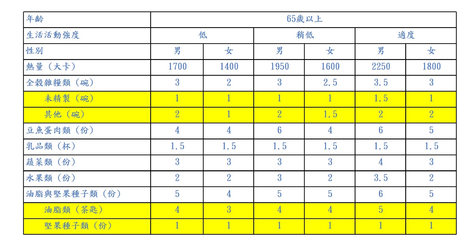 依生活型態不同與性別的區別, 65歲以上銀髮族的每日飲食建議量:
