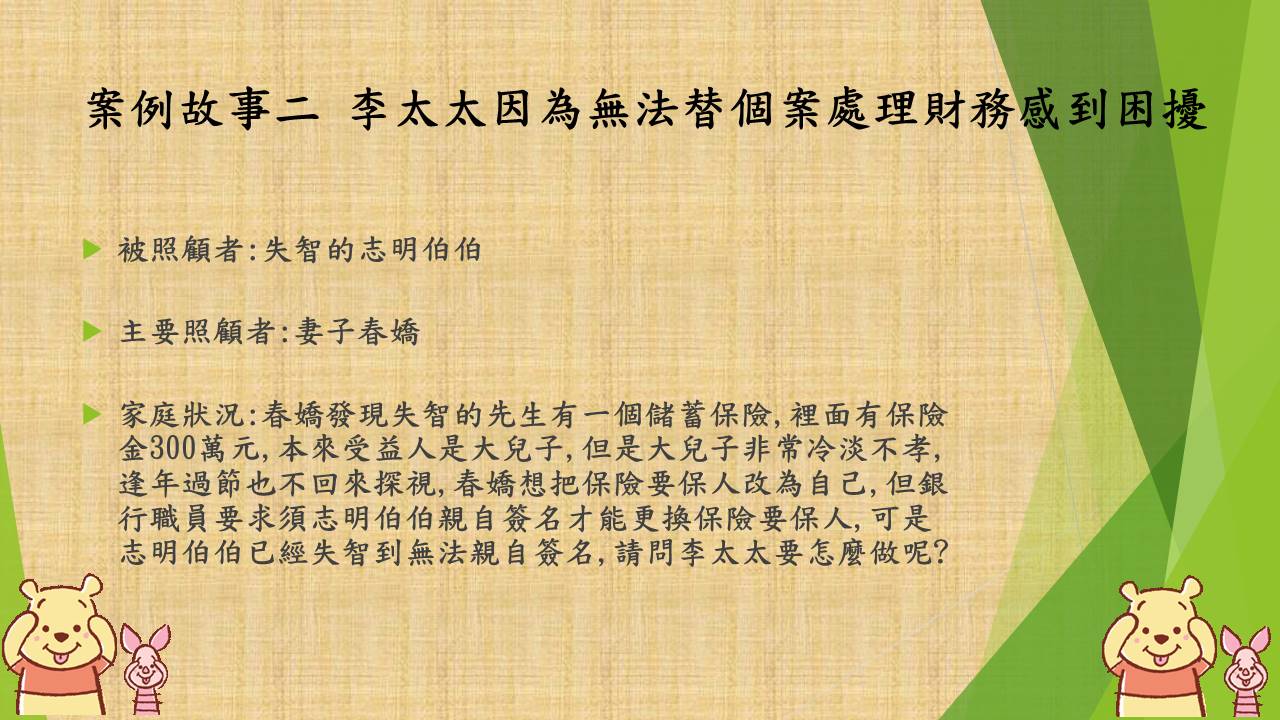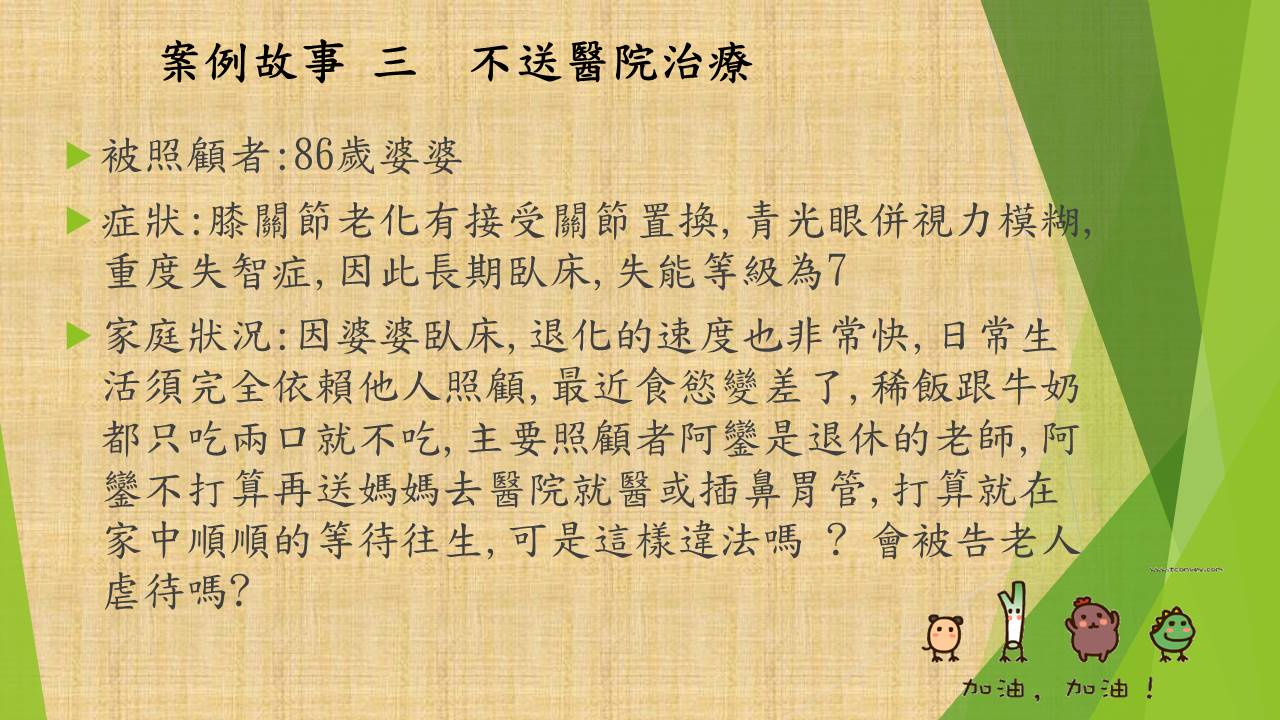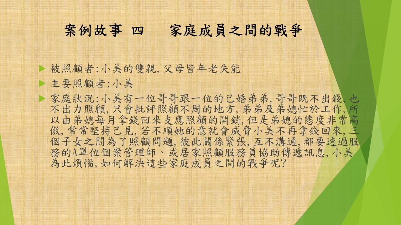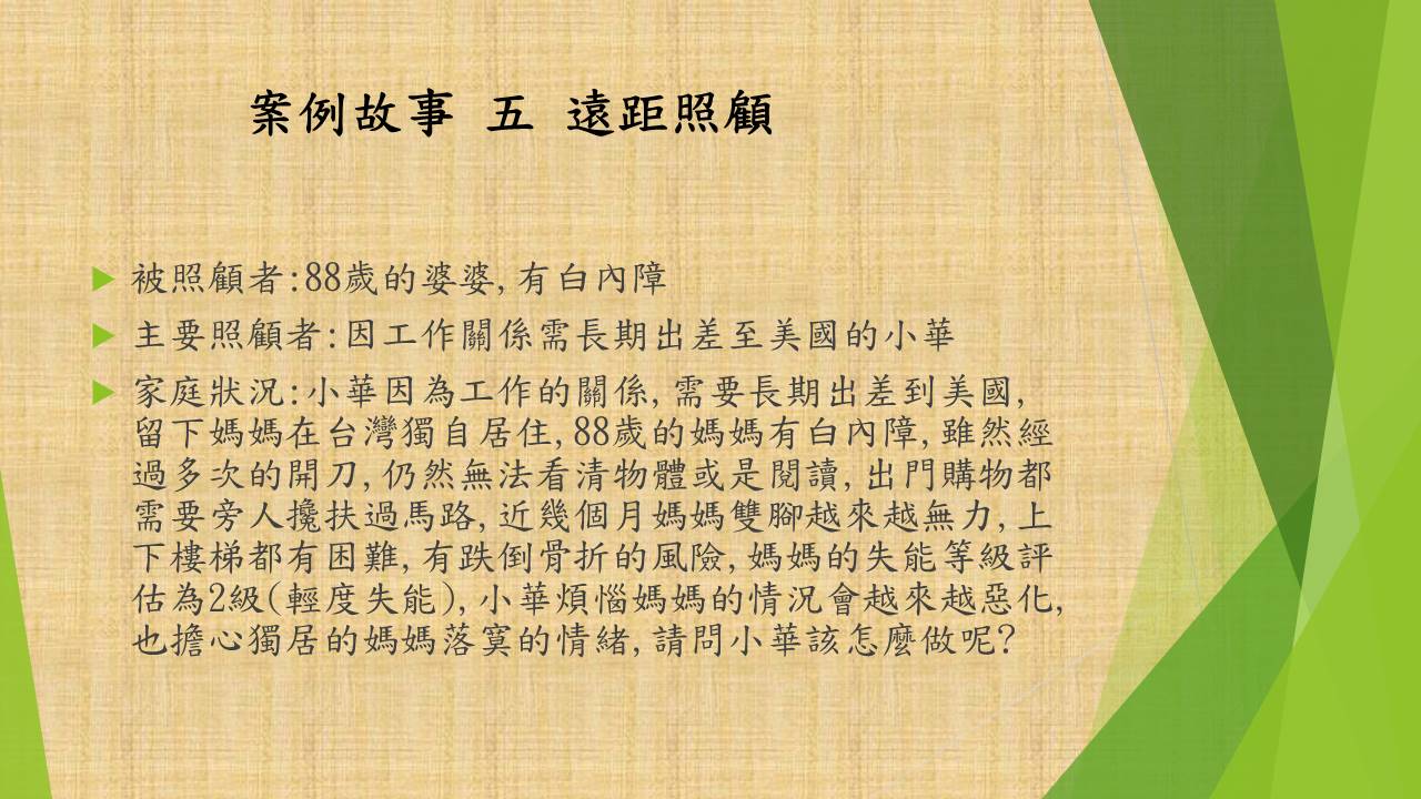 照顧問題來自以下七個故事的衍申。