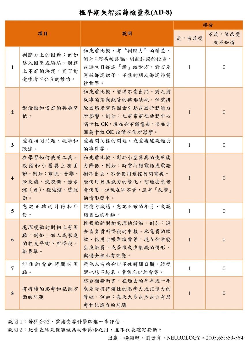 失智極早期篩檢量表 (AD-8)幫作自行做初步篩選