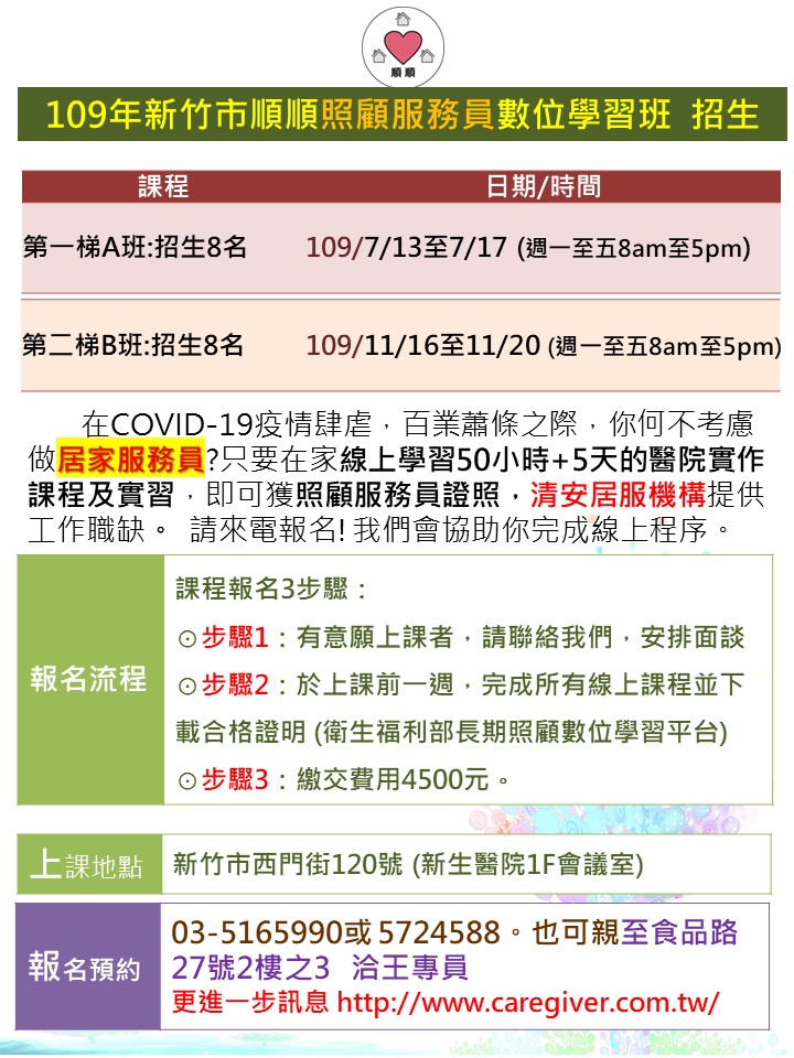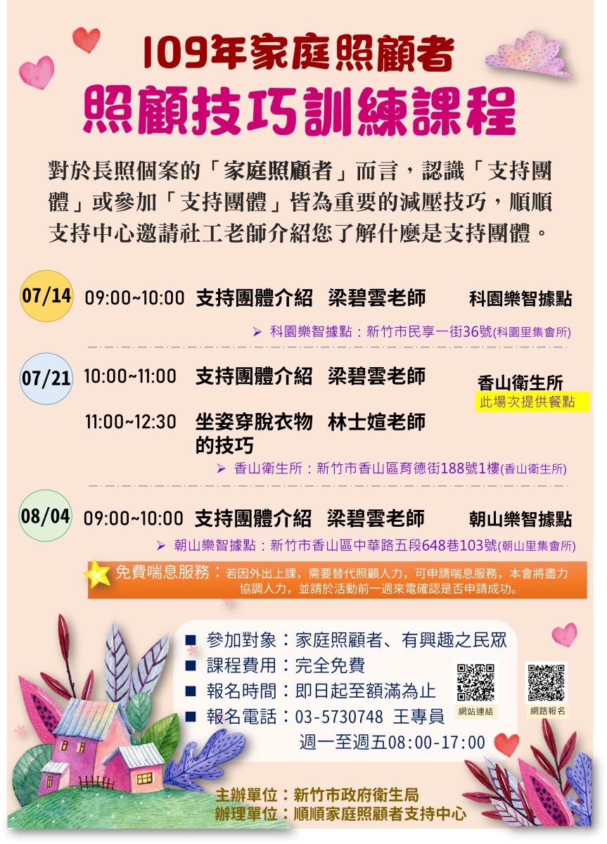 本課程也申請長照人員繼續教育積分認證中。有興趣知道新竹地區其他急救或長照課程資訊者,可以匿名加入「新竹長照教育看板」(按此連結,加入密碼 1900),會有很多相關單位在此發佈課程公告。 此社群是訊息是公開、公有的,勿在此教育看板張貼個人資料,並請遵守記事本上之社群公約。